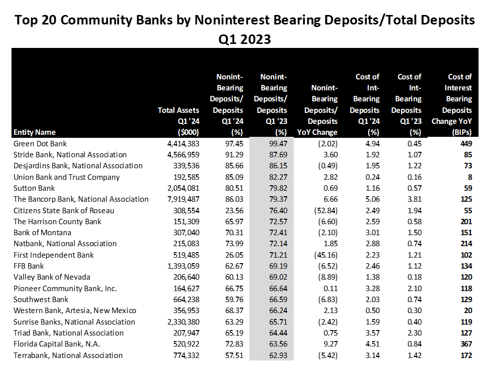Figure 2: Top 20 commercial community banks ranked by ratio of noninterest bearing deposits-to-total deposits as of March 31, 2023