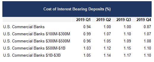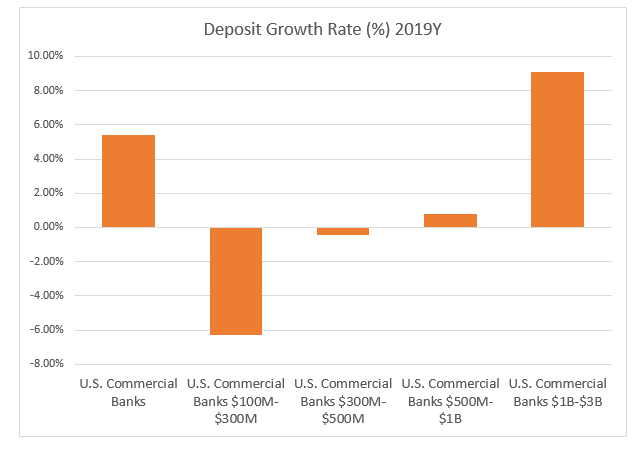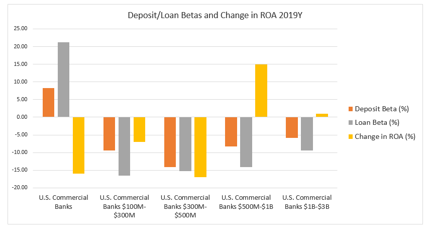 Moving from U.S. commercial banks with $100M-$300M in assets to U.S. commercial banks with $1B-$3B in assets, deposit growth increases and deposit betas increase (except for the $300M-$500M group that raised deposit rates the most during 2019).