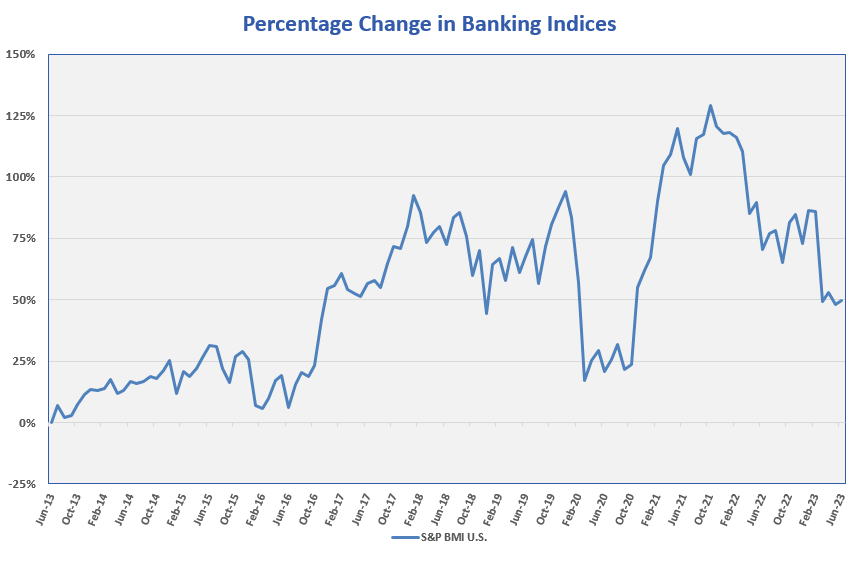 Despite a temporary decline in the risk-free rate during March and early April, the 20-year U.S. Treasury is now back above 4% and was 4.06% as of June 30, 2023. Correspondingly, the equity risk premium at June 30, 2023 has reached levels not seen since 2008-2009. This produces negative effects on the discounting of future cash flows. The good news is that bank earnings are up for many banks, which partially mitigates the higher discount rates. However, bank valuations for our community bank valuation clients have been negatively affected by the decline in public bank stock pricing during 2023. As illustrated in the following chart showing the U.S. Broad Market Bank Index, public bank stock pricing took a fall in March 2023, similar but not equal in magnitude to the decline seen in March 2020. Public bank stock pricing has seemed to reach a bottom since the liquidity crunch of this Spring but will continue to place downward pressure on valuations as it nears levels not seen since 2020.