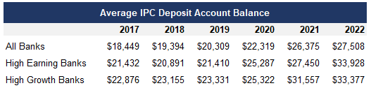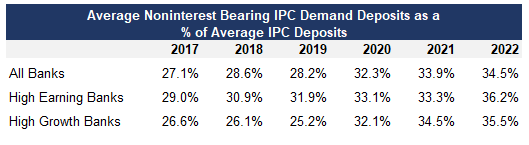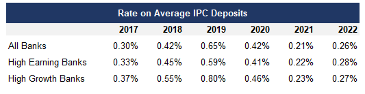 As illustrated in the preceding table from data collected through The Bank CEO Network, high earning banks consistently (except for 2021) reported a greater percentage of average noninterest bearing Individual & Partnerships, and Corporations (IPC) demand deposits as a percentage of average IPC deposits than their lower earning peers. Or, put another way, banks that have less reliance on interest-bearing core funding typically perform better than those banks that have more regardless of what they pay for interest-bearing deposits. Additionally, the high performing banks also reported the highest average deposits per IPC account (i.e., high performing banks have deposit accounts with larger average balances). Interestingly, the highest performing banks paid slightly higher rates than average on their core funding during rising interest rate environments (2017, 2018, 2022). However, they were able to respond to falling rates, like what we saw in 2019, much quicker than average, reporting a rate on average IPC deposits six basis points below all banks.