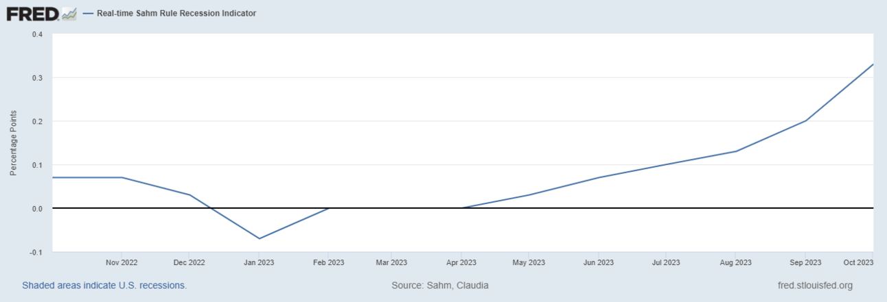 As of October 2023, the three-month moving average for the unemployment rate was 4.3%. The low of the three-month moving average for the previous 12 months was 4.0%. 4.3% - 4.0% = 0.3%, 20 basis points away from the beginning of a recession according to the Sahm calculation. This is certainly not the only measure of recession risk. But combining the rise in unemployment with student loan repayments possibly resuming and record high credit card delinquencies could be quite the millstone on consumer spending moving forward.