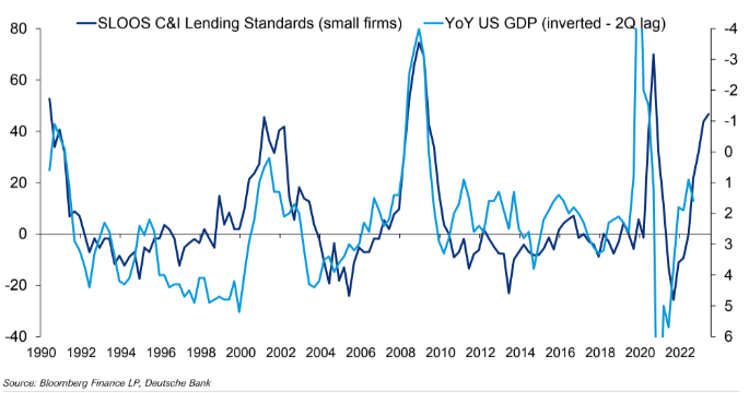 In the chart, however, there is positive GDP growth for the last two quarters (again, GDP line is inverted) despite the increase in lending standards. We would not expect this to continue given the previous 30 years of data showing the opposite correlation.
