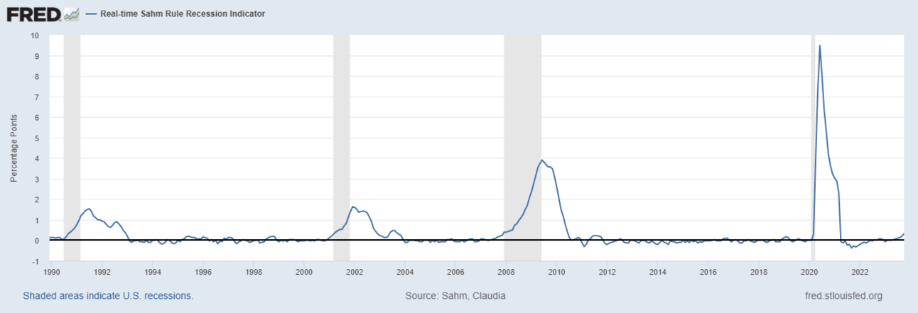 Further, recent reports show that the job market is more fragile than earlier in the year, likely the reason the Fed elected at its November meeting to pause rate hikes. The chart below illustrates the Sahm rule dating back to 1989 with the blue line illustrating the unemployment rate and the shaded areas noting recessionary periods. The Sahm rule dictates that when the three-month moving average of the unemployment rate rises by 50 basis points or more relative to its low during the previous twelve months, then the economy is in the beginning of a recession.