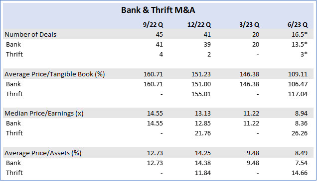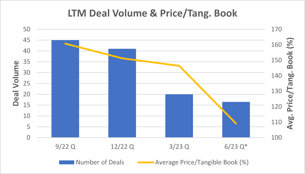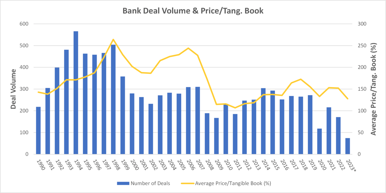 Zooming out from our current landscape as far back as our data will allow (1990), we find that despite the flurry of fiscal stimulus and subsequent economic activity in 2020 and 2021, whole bank transactions never quite recovered to their pre-Covid form on a deal volume basis. The last three years more closely resembled Great Recession era deal activity despite a lack of credit deterioration that was prevalent during the financial crisis. While multiples partially recovered from 2020 declines, albeit supported by quantitative easing, 2023 has brought a steep decline in whole-bank pricing in relation to tangible book value. The average 2023 price/tangible book multiple of 1.28x is 26% lower than the recent 2018 peak of 1.73x. Maybe more telling is that the 1.09x price/tangible book multiple for the second quarter of 2023 is only about 2% higher than the 1.07x price/tangible book that was observed in 2011 following the 2008 downturn.