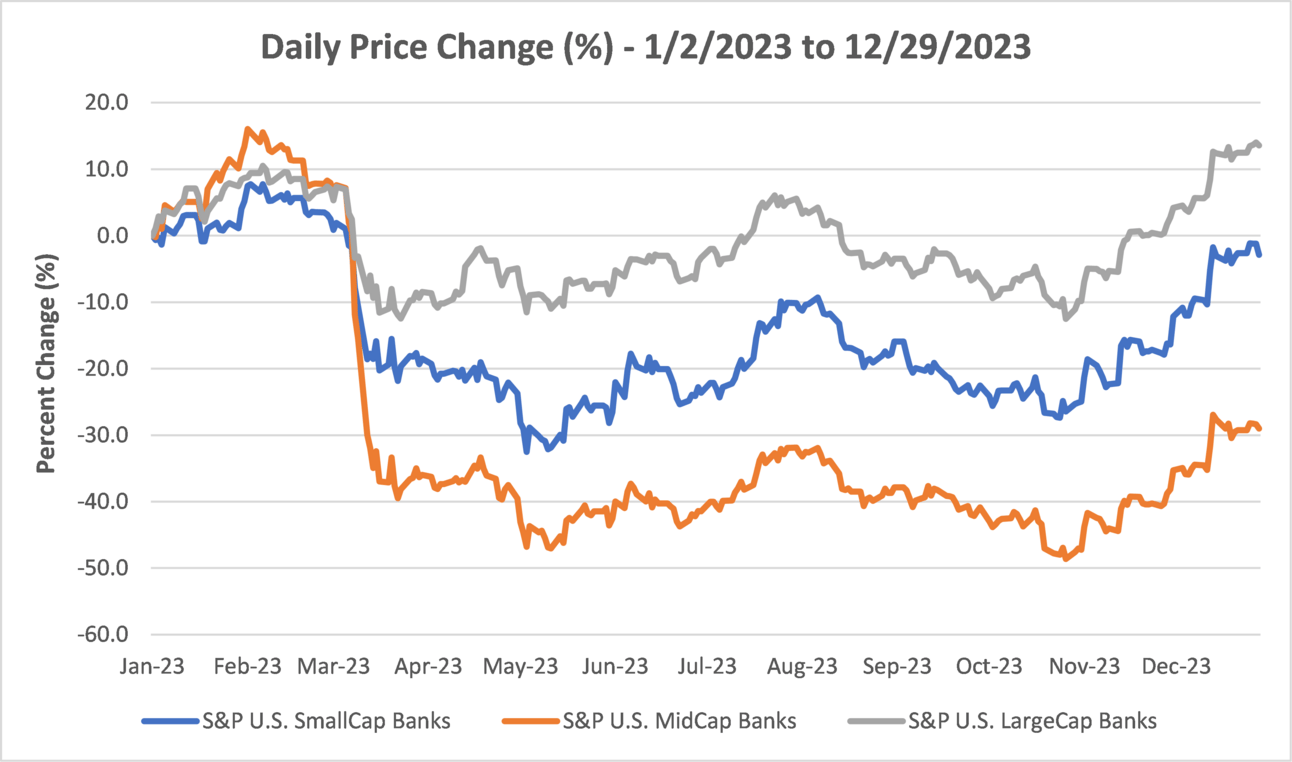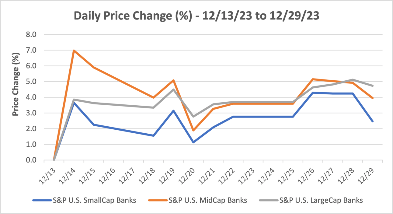 The chart below shows the bank index price movements of publicly-traded banks categorized by market capitalization in the 12 trading days following the Federal Reserve’s press conference on December 13, 2023: