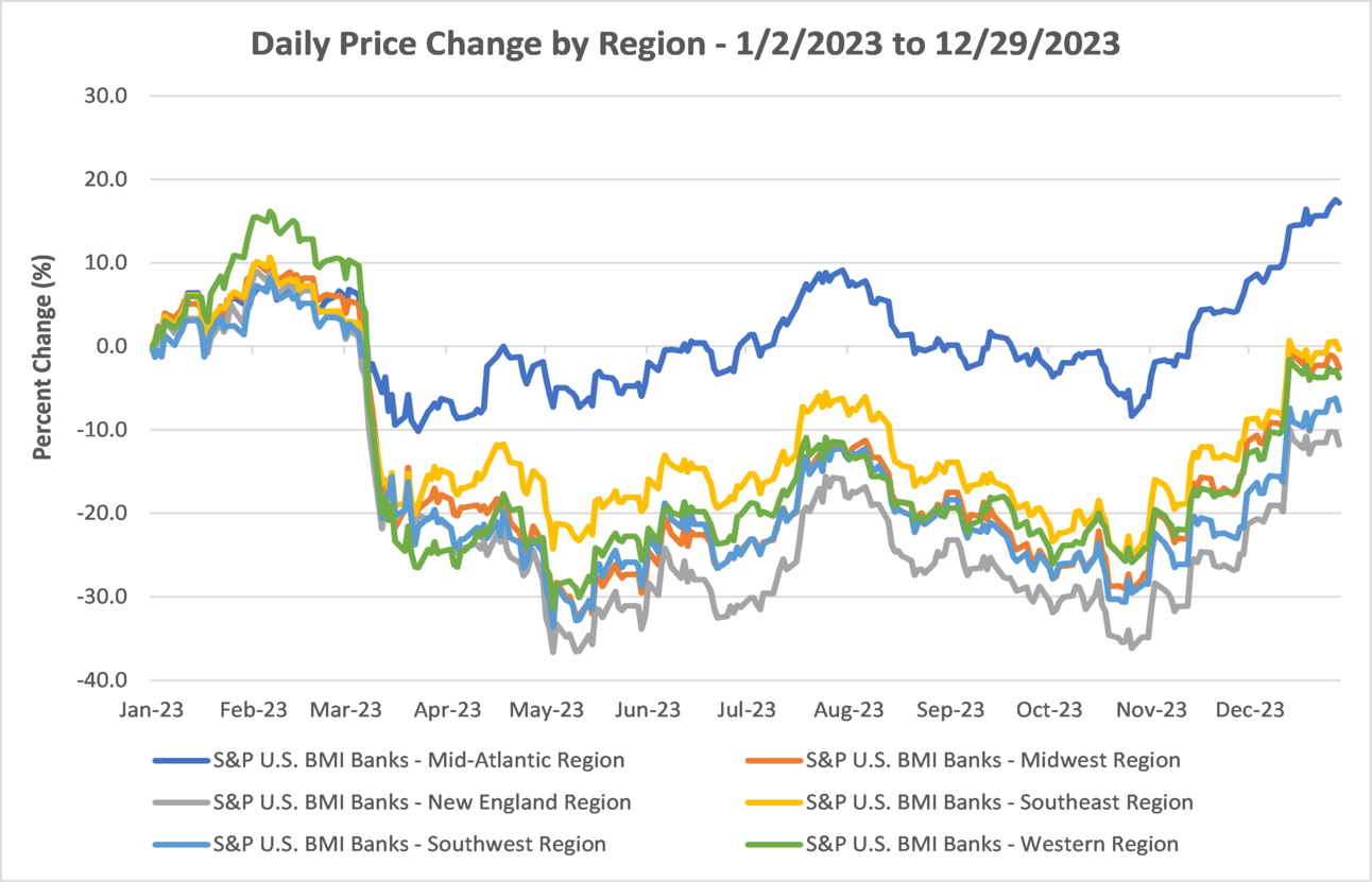 As illustrated in the chart above, publicly-traded bank stocks experienced a dramatic price increase immediately following the previously mentioned Federal Reserve announcement on December 13th . The S&P U.S. MidCap bank index had the largest increase, likely the result of regional banks experiencing the largest decline earlier in the year (as shown below) due to most of the bank failures occurring in this segment.